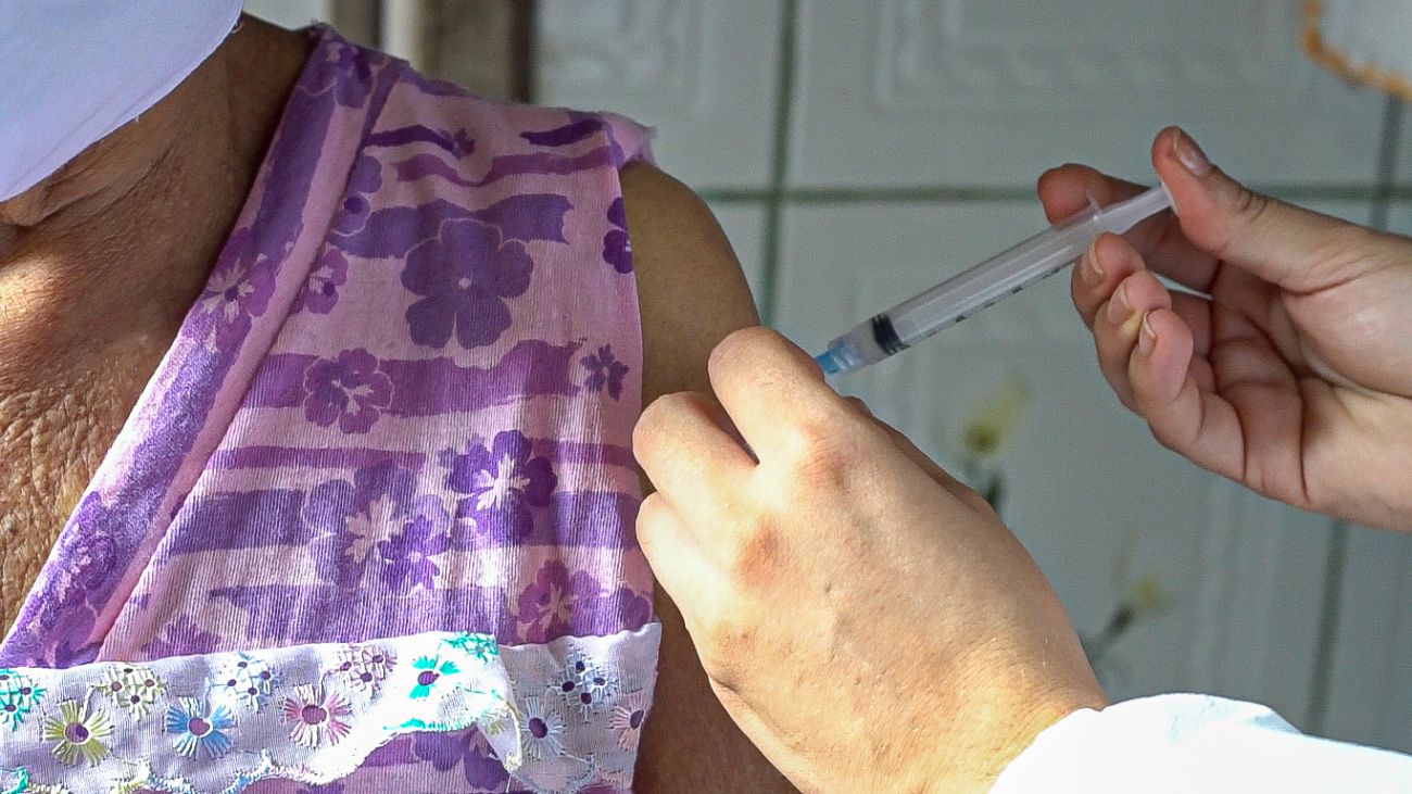 Maria de Nazaré Magalhães, de 88 anos, recebendo a primeira dose da vacina CoronaVac.