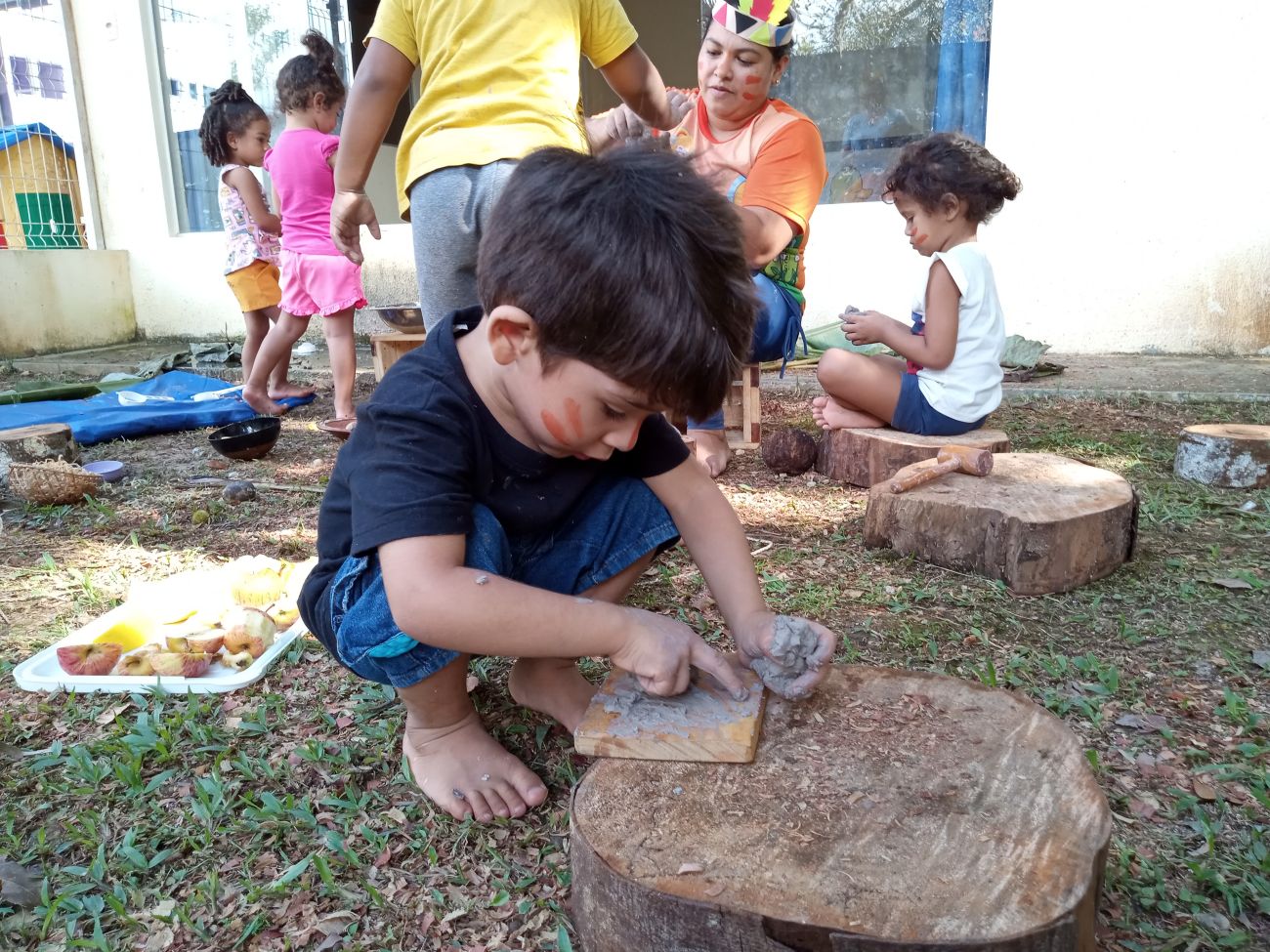 “Eu confesso que senti um pouco de medo nessa experiência. Minha aluna, por exemplo, pegava os elementos da natureza, e depois voltava a chorar. Depois, ela se encontrava novamente no brincar. Uma professora colocou uma bacia com água perto dela, e então chamou a atenção e ela conseguiu brincar, misturando urucum na água, depois misturou vários elementos, pegou uma colher e ficou mexendo. Eu ainda não tinha trabalhado com a água e os elementos assim com as minhas crianças. Um outro aluno ainda não tinha tido contato com a natureza desse jeito, e ele conseguiu interagir, pegou o urucum e ficou se pintando. Então foi uma experiência extraordinária para eles, para nós foi muito gratificante”, relatou.