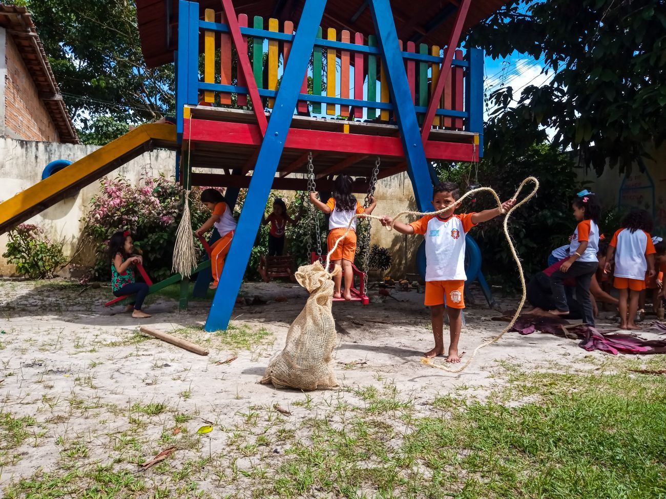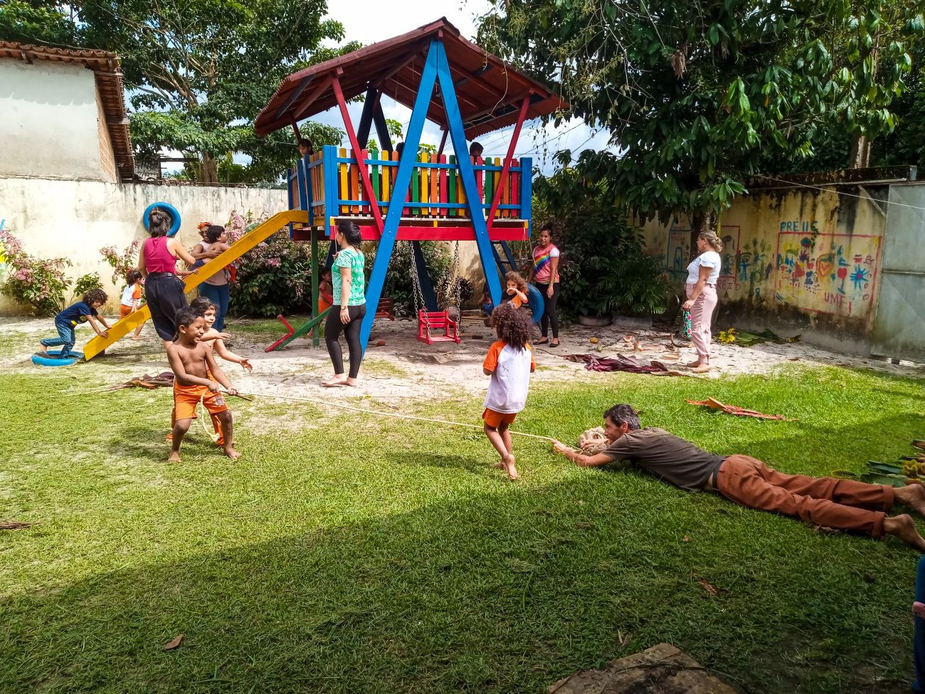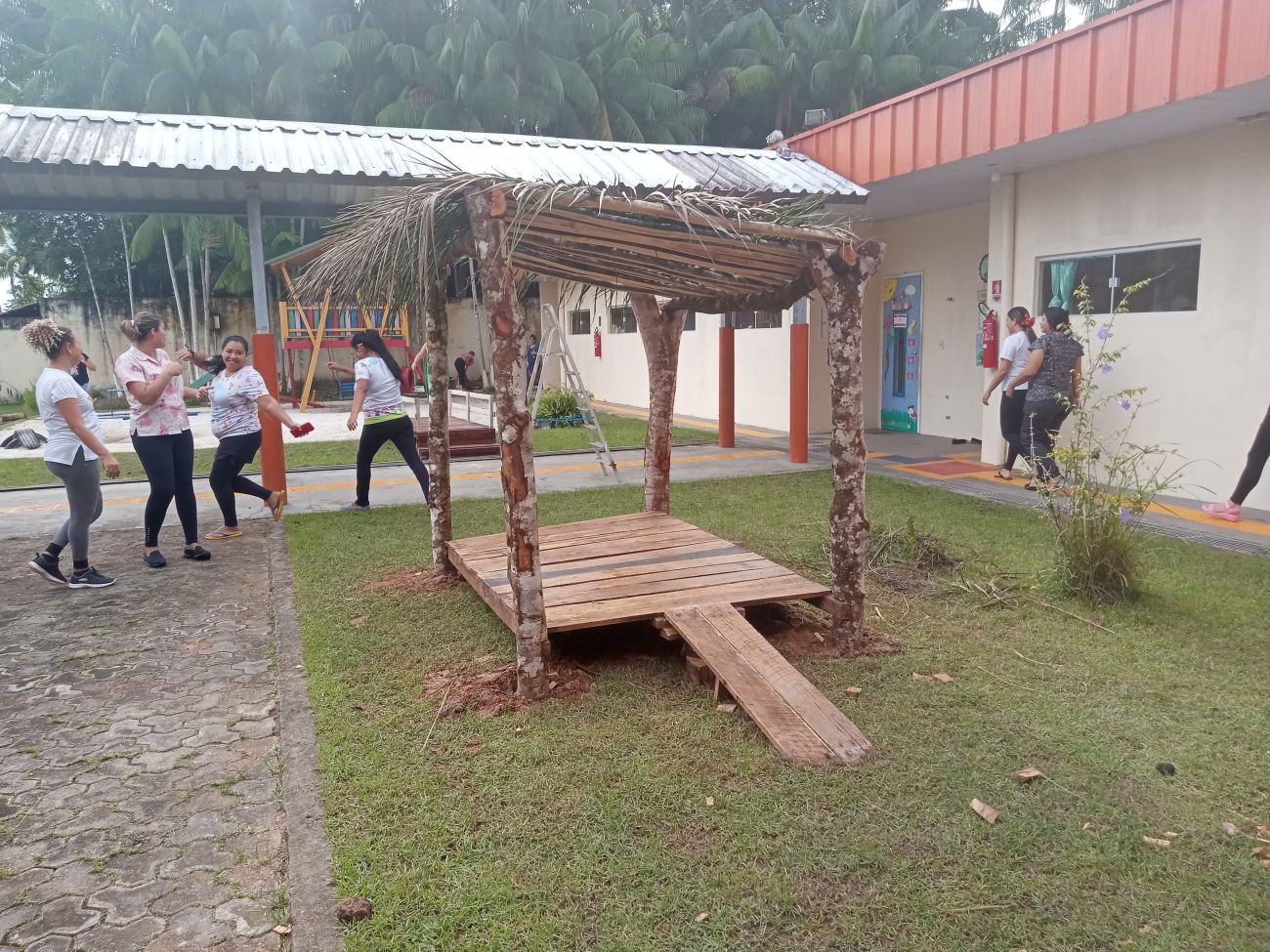Pensando no território das crianças, foi construído uma Tapiri, uma casinha livre feita de materiais improvisados como madeira, bambu e folha de açaizeiro, e uma rampa de acesso. Mais ao longo, uma ponte que estava sem uma utilidade na escola, que foi reaproveitada e posicionada ao centro do quintal, dando passagem às outras possibilidades de brincar.