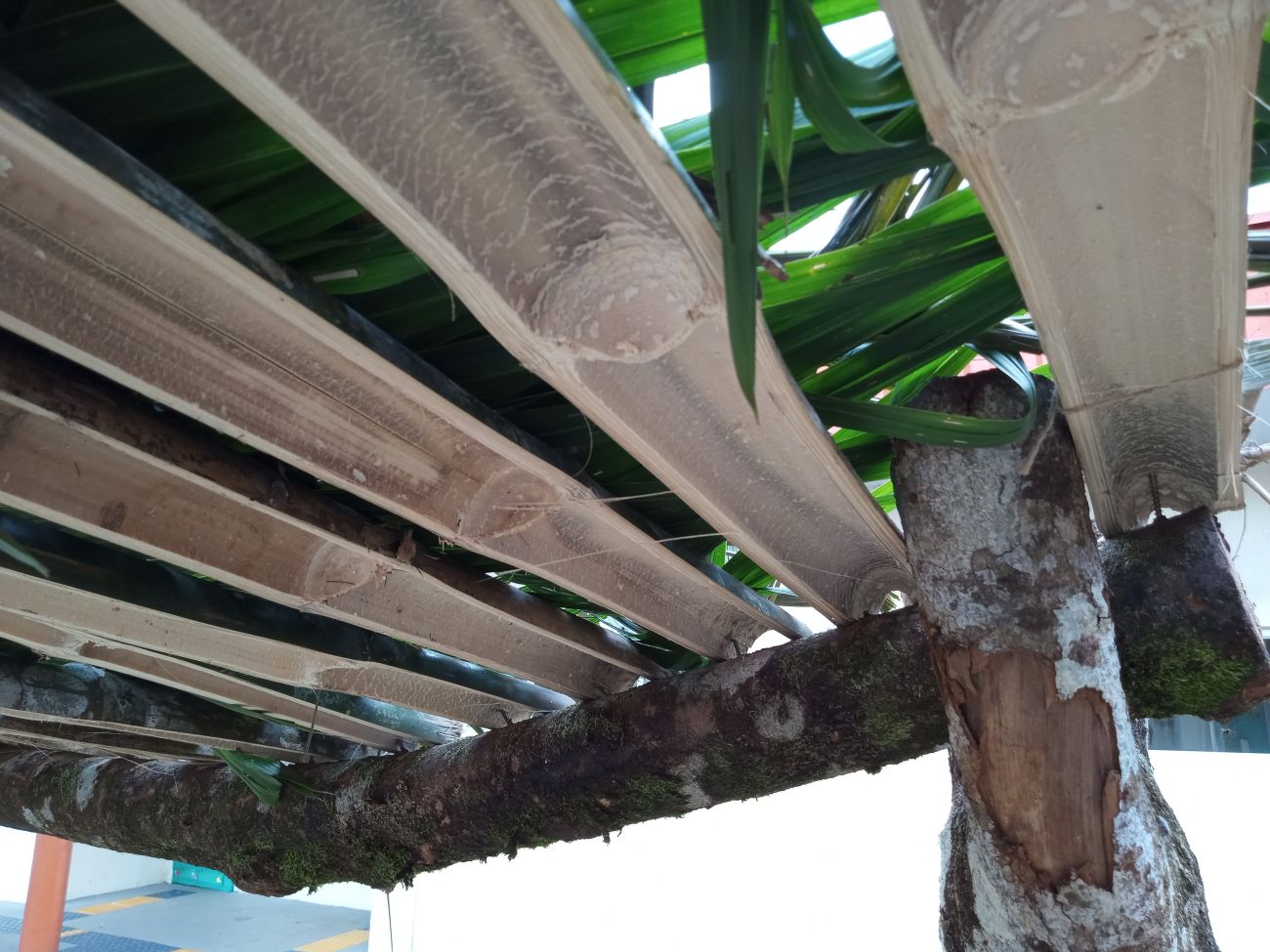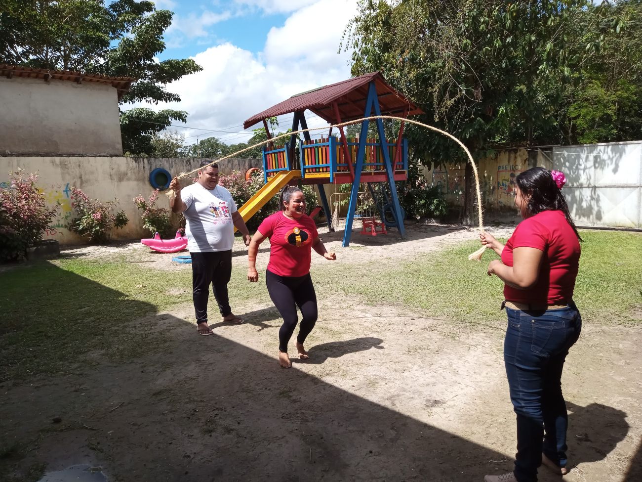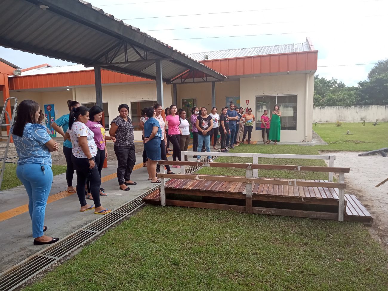 Pensando no território das crianças, foi construído uma Tapiri, uma casinha livre feita de materiais improvisados como madeira, bambu e folha de açaizeiro, e uma rampa de acesso. Mais ao longo, uma ponte que estava sem uma utilidade na escola, que foi reaproveitada e posicionada ao centro do quintal, dando passagem às outras possibilidades de brincar.