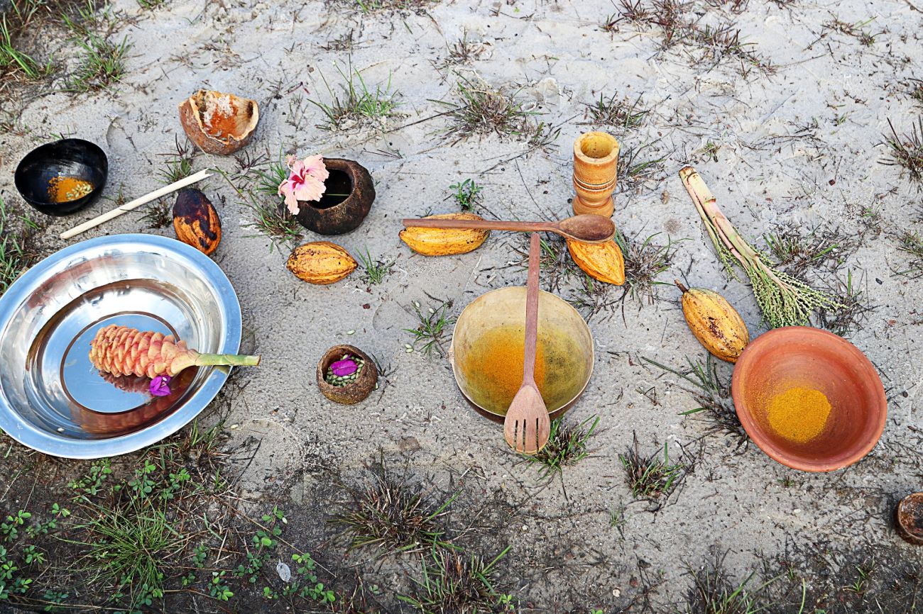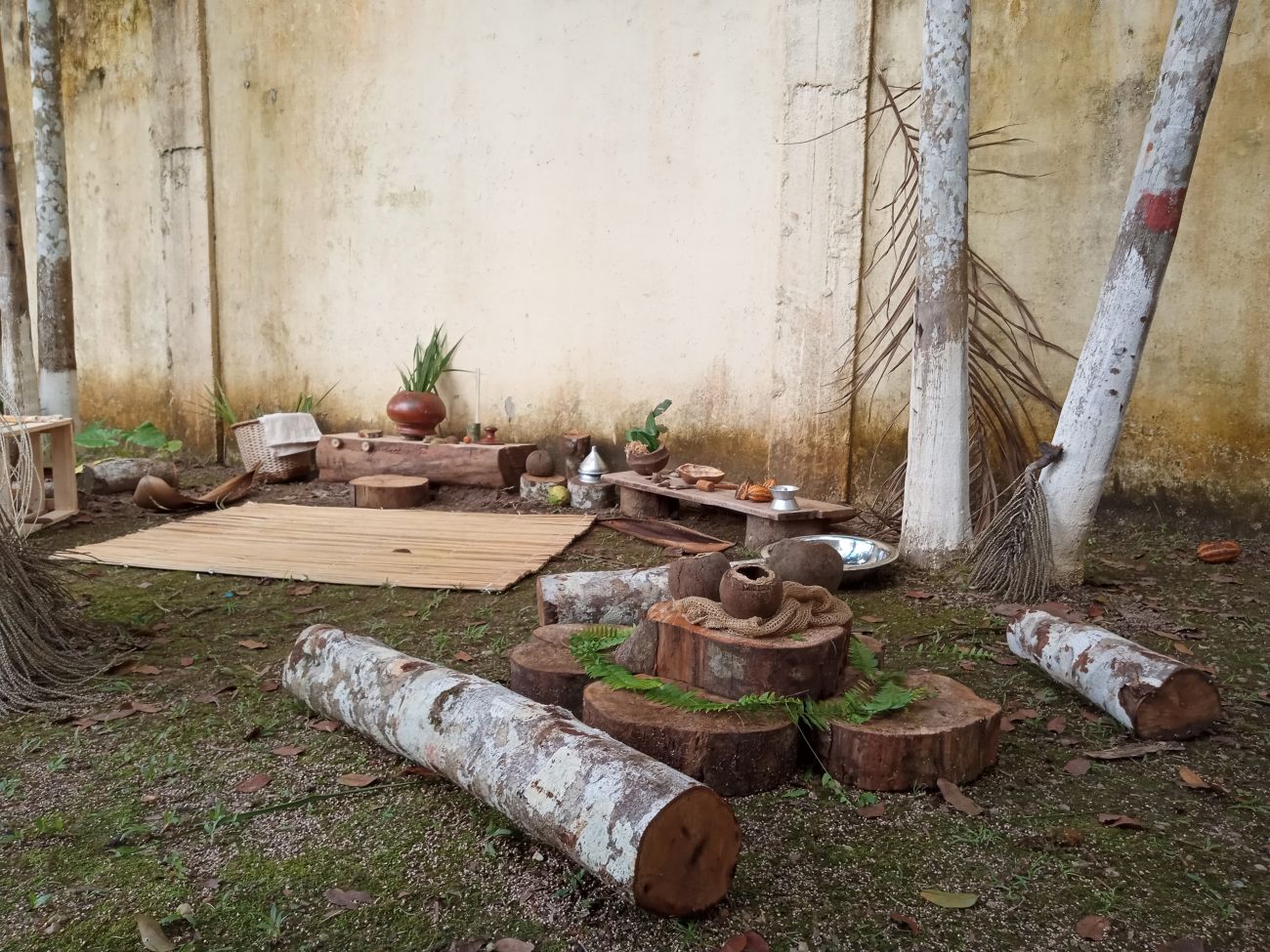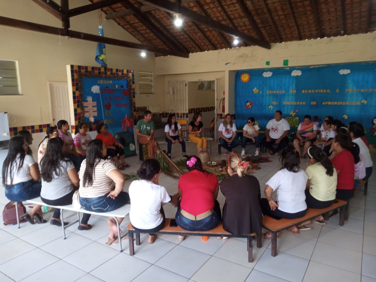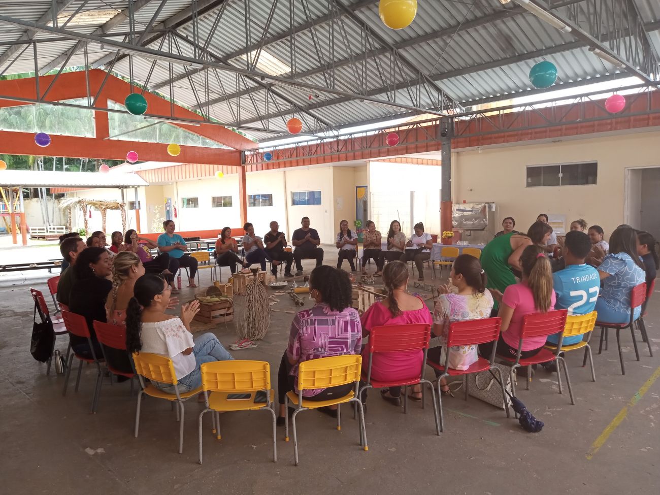 Enquanto os professores trocavam ideias e experiências, havia no centro da roda vários objetos artesanais e diversos elementos naturais da região, como urucum, ouriço de castanha, palhas e folhas de açaí, andiroba, cacau, martelinhos de madeira, massinha de argila, bolachas de madeira, pedaços de miriti, sementes, flores, caixotes, cuias, e outros, para que os professores pudessem interagir com eles.