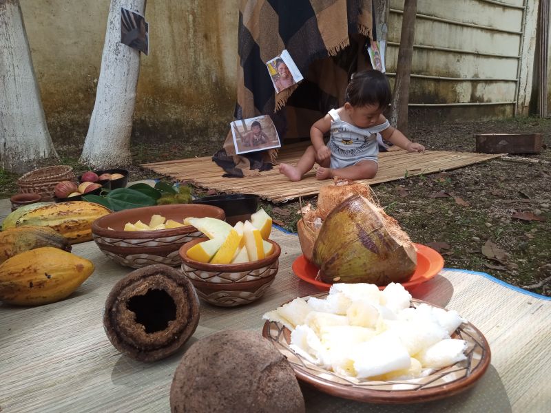 Uma menina em uma cozinha quebrava com uma colher de pau várias sementes e frutos para retirar e usar o que tinha dentro, numa curiosidade e descoberta incessante. Ao quebrar os elementos, colocava em uma cuia e misturava tudo. Fazia isso repetidamente.