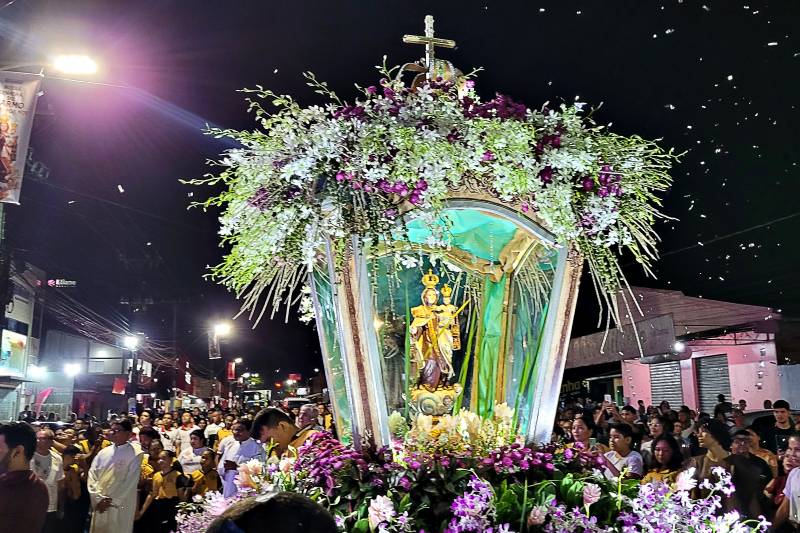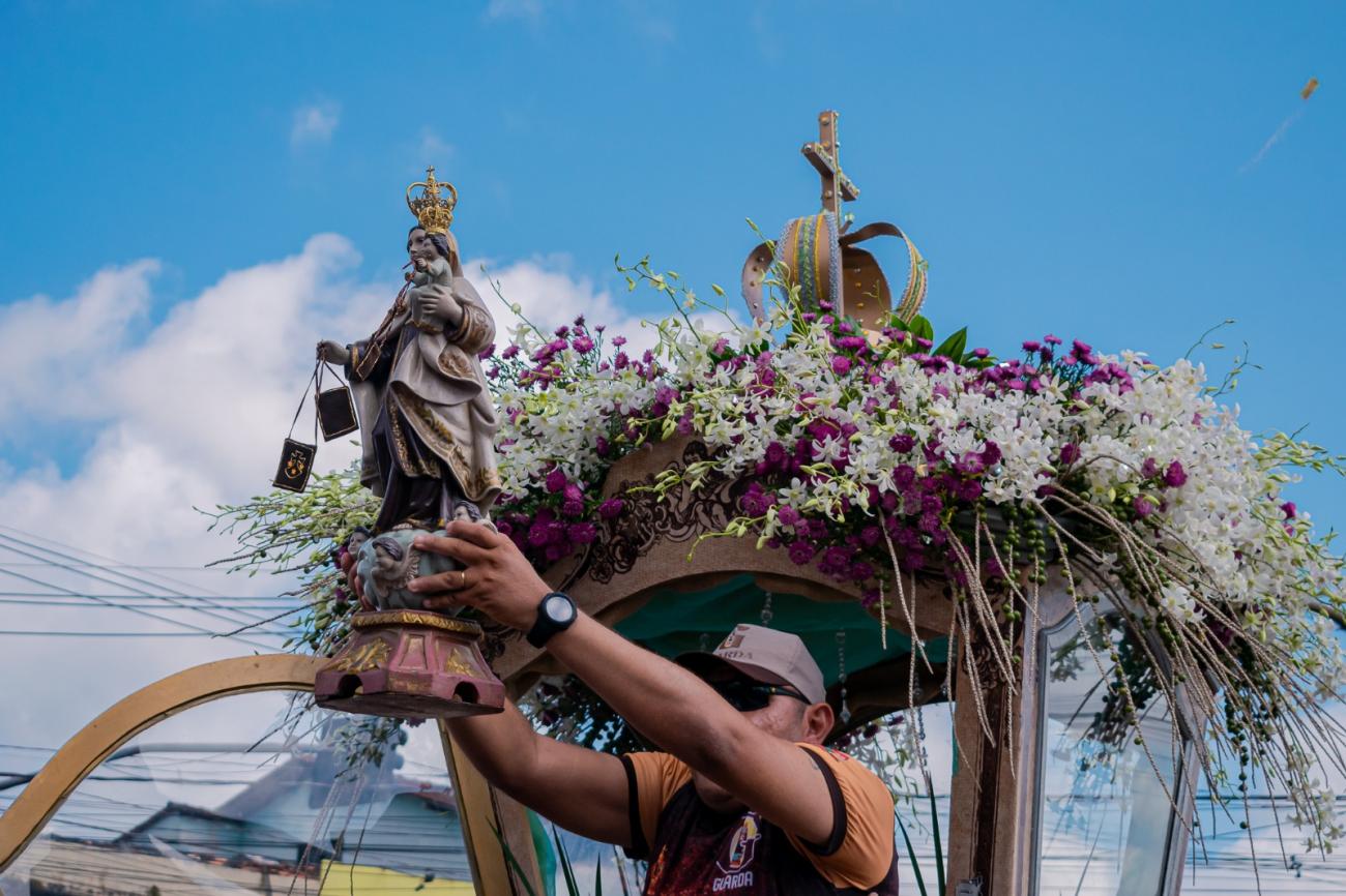 No domingo, a procissão saiu da paróquia de Santa Rosa de Lima por volta de 8h30, após missa celebrada no salão paroquial, e cumpriu trajeto até a igreja matriz, no centro da cidade, onde chegou pouco antes das 10h. Um tempo curto e um percurso curto em relação aos anos anteriores. A fé e a alegria dos devotos, porém, não se alteraram. E isso ficou evidente nas expressões. Os agradecimentos e pedidos de graças eram constantes nas mãos erguidas em direção à berlinda com a imagem da Santa, nos cânticos entoados e no olhar de quem está se sentindo abençoado. O tema da festividade este ano é “Mãe do Carmelo, ensinai-nos a ser igreja missionária”