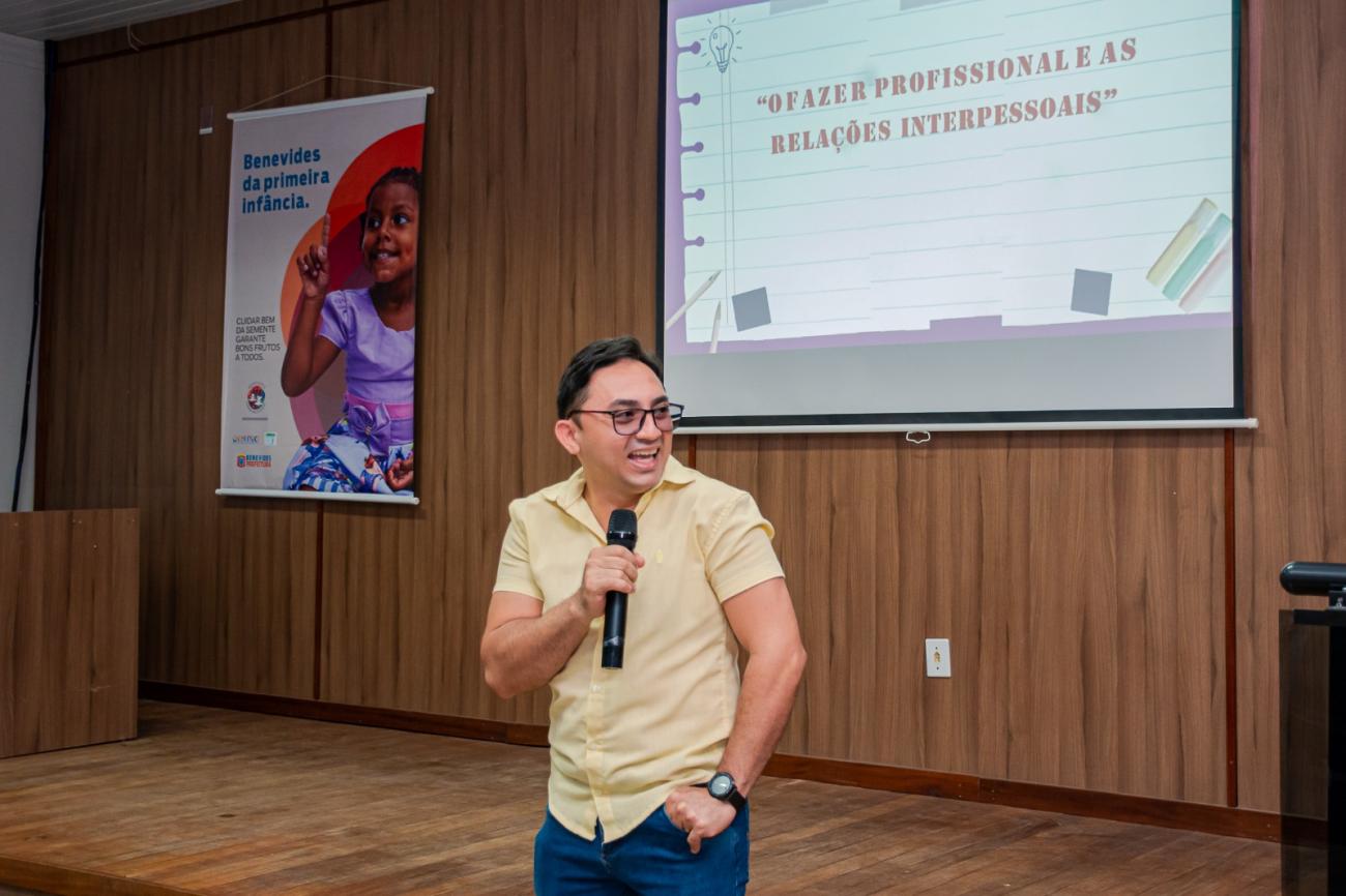 A rede municipal de ensino de Benevides cresceu este ano de 9.700 para 11 mil alunos, matriculados em 36 escolas. “Expandimos a rede em mais de 10%, zeramos a fila do maternal e estamos com 4 escolas em tempo integral. Vamos construir mais uma CMEI, porque entendemos a necessidade dos pais que precisam trabalhar e depositam confiança na equipe de Educação e nesta gestão municipal”, expôs o secretário municipal de Educação, Josué Pompeu. Dirigindo-se mais diretamente aos participantes do encontro, o titular da SEMED destacou a importância de cada um no trabalho da rede como um todo. “Vocês são fundamentais neste processo. Precisamos manter a qualidade, a precisão e a responsabilidade para não deixar nenhum aluno fora do sistema”, pontuou.