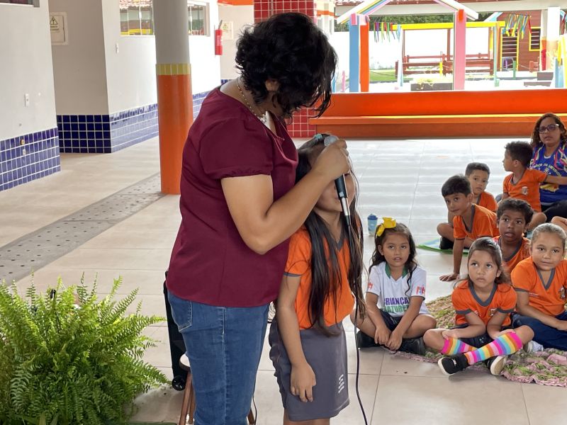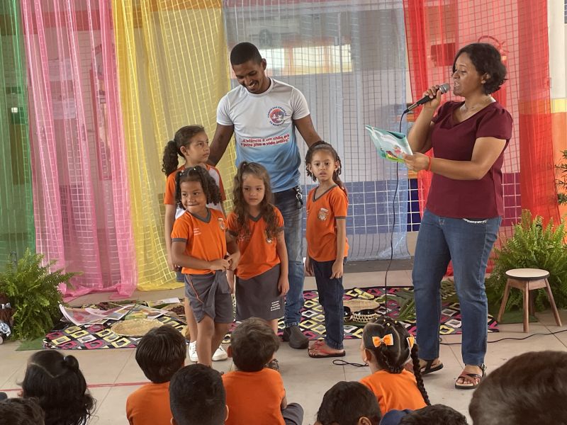 A primeira etapa iniciou com estímulo de contação de história. O livro intitulado “Cabelo de Bolinhas: A menina cor de chocolate”, escrito pela professora Rosineide Gama, de Benevides, conta a história de uma menina que se reconhece no mundo e começa a enxergar beleza na sua própria identidade.