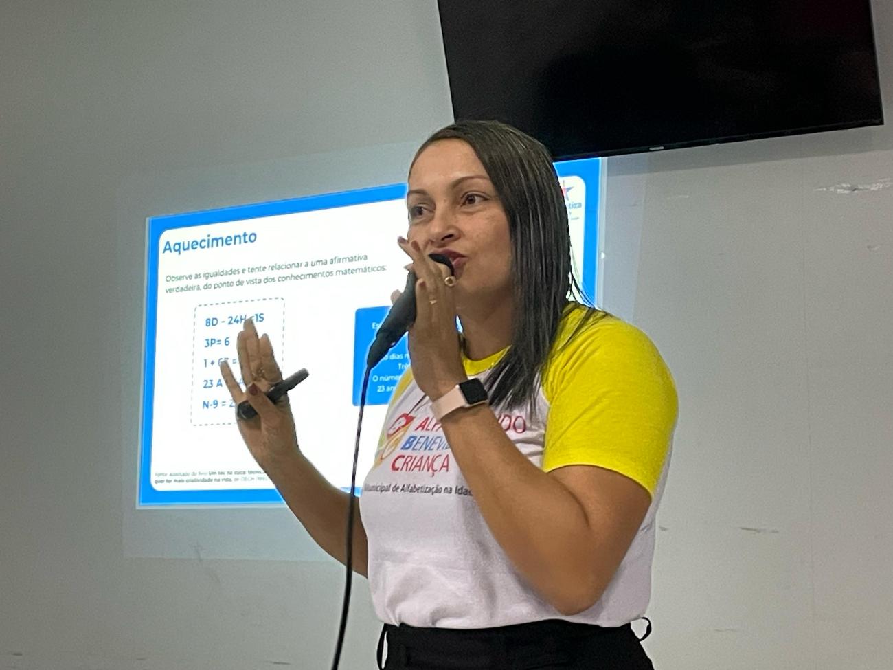 O encontro foi ministrado pelas professoras formadoras Cássia de Lima e Mara Simone, por meio do Programa Alfabetizando Benevides Criança (ABC), que explanaram sobre práticas pedagógicas para melhorar o desempenho dos alunos na alfabetização nas áreas da língua portuguesa e da matemática para desenvolver pensamentos matemáticos.