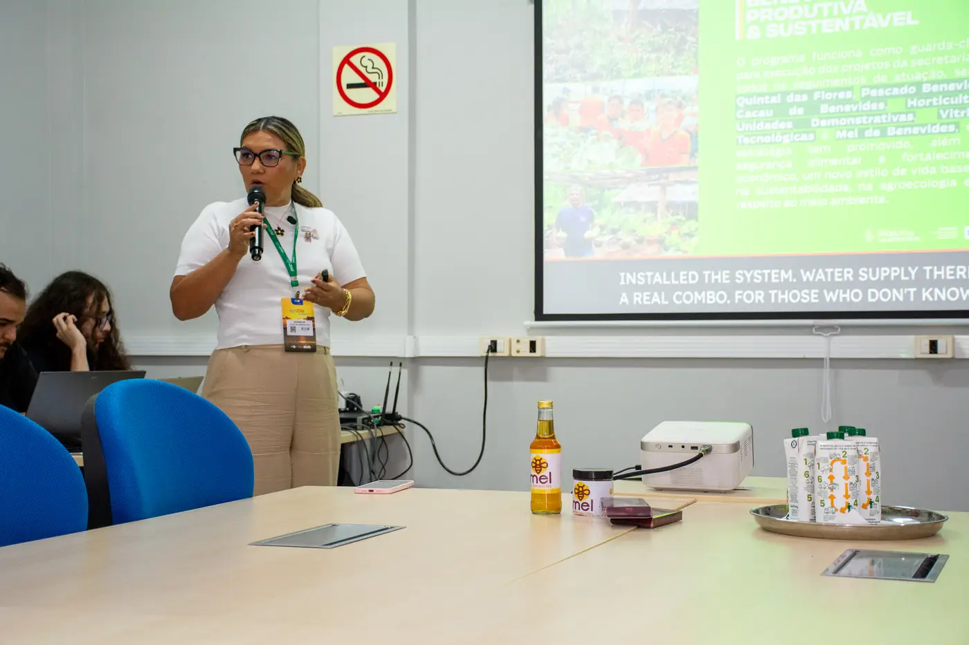 A apresentação técnica do Programa Benevides Produtiva & Sustentável foi conduzida pela própria Secretária de Agricultura e Abastecimento, e vice-prefeita de Benevides, Edivana Lima, acompanhada por técnicos e equipe especializada. O painel detalhou os projetos, indicadores e o futuro da agricultura em Benevides, capturando a atenção de experientes pesquisadores da Embrapa e de empresários de grandes complexos industriais do Brasil.